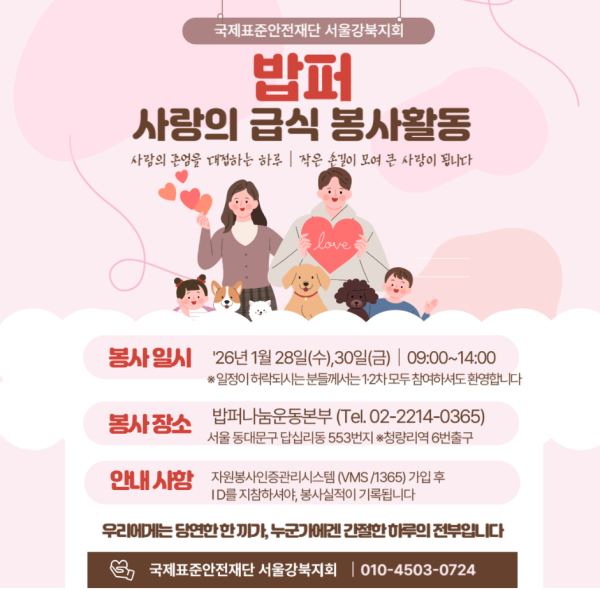 서울강북지회 등록일2026.01.28 조회수112 서울강북지회는 마포지회와 함께 2026년새해 봉사활동을 전개합니다.지회간의 협업을 통한 국제표준안전재단의 홍보와 봉사활동을 시너지를 극대화할수 있는계기가 될것이라 확신합니다.적극적으로 동참해주신 신유미지회장님께 감사함을 전합니다.밥퍼나눔운동본부의 자원봉사는 1월 28일(수)1월30일(금) 2회에 진행예정입니다. 댓글 0댓글쓰기 댓글목록 등록된 댓글이 없습니다. 이전글 경남 마산.창원 다음글 경기주부본부(군포,의왕) 2강교육 목록